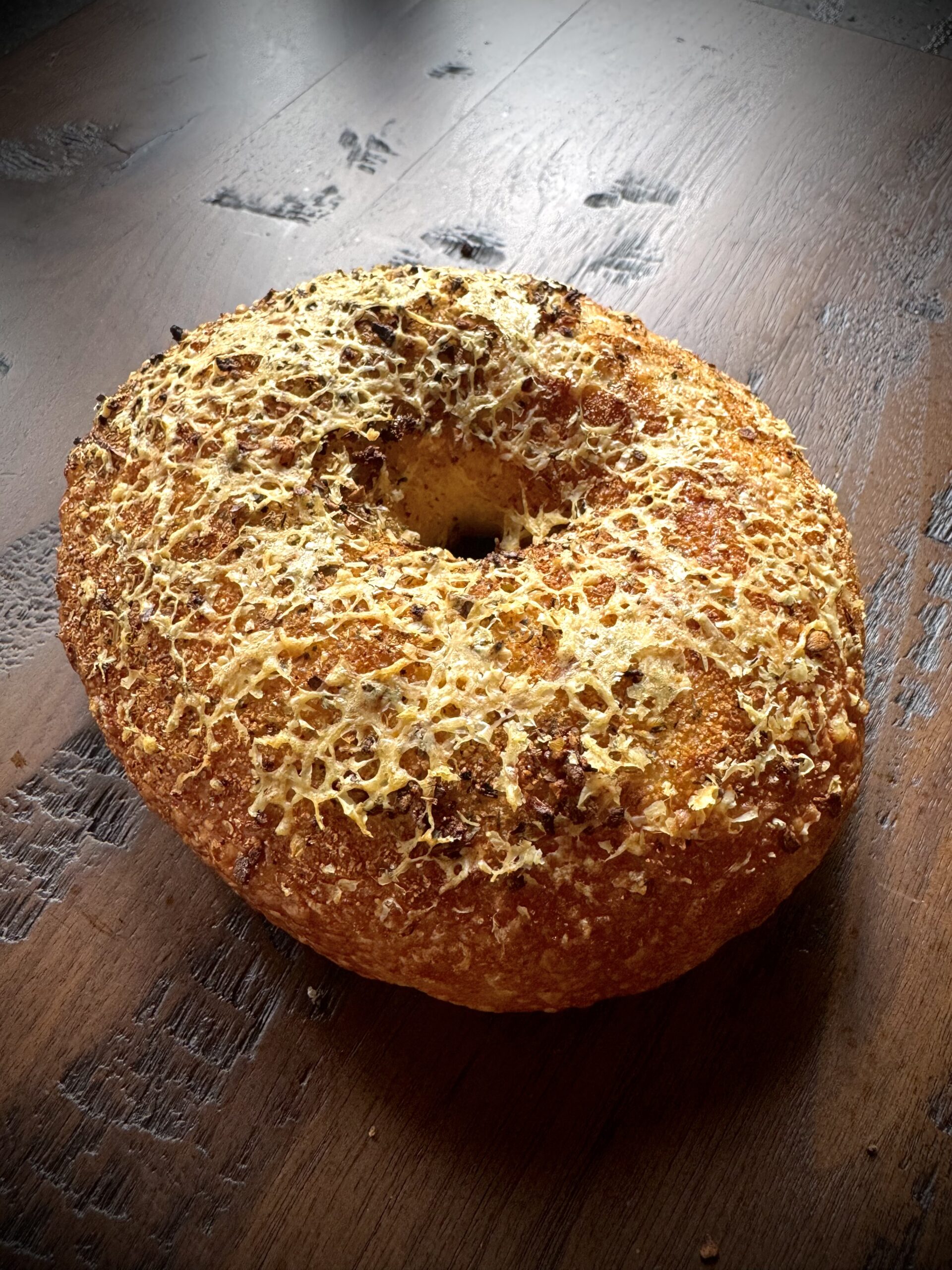 Savory garlic and Asiago cheese bagel.